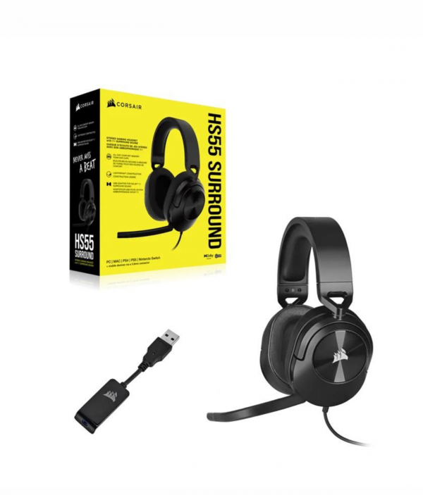 Sumérgete en el sonido del juego con los auriculares estéreo para juegos Corsair HS55 en color negro. Ligeros y cómodos, estos auriculares ofrecen un audio de alta calidad y un micrófono con cancelación de ruido abatible para una comunicación clara con tu equipo. Sus almohadillas de espuma viscoelástica y su diadema ajustable te permiten jugar durante horas con total confort.